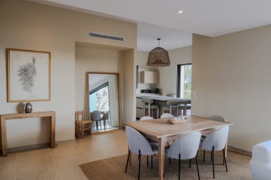 Die villa ist hell mit einem Wohnbereich bestehend aus einem Wohn - /Esszimmer und einer angrenzenden Küche, beide mit Blick auf das Meer.