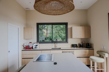 Die Küche mit Mittelinsel ist komplett ausgestattet mit Kühlschrank, Backofen, Mikrowelle, Nespresso-Kaffeemaschine, Thermomix, Entsafter, Wasserkocher usw.. Ein Hauswirtschaftsraum mit Waschmaschine, Trockner und Bügeleisen / -Brett ist ebenfalls zugänglich.