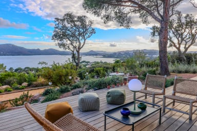 Wunderschönes äußeres mit angelegtem Garten. Eine schöne terrasse mit Blick auf die Bucht von Porto-Vecchio, bestehend aus einem Esstisch, einem gemütlichen Wohnzimmer und einem Grill / plancha