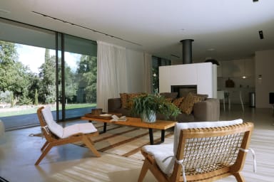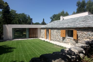 • Schlichte, moderne Architektur, kombiniert mit Stein und Holz