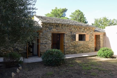 Mitten in einem baumbestandenen Park, in dem Innen- und Außenräume nahtlos ineinander übergehen – im Schatten großer Eichen oder in der kühlen Geborgenheit alter Steinmauern – bieten die Villas Verroust ein seltenes Erlebnis: den diskreten Luxus eines charaktervollen Anwesens, eingebettet im Herzen der AOC-Weinberge von Patrimonio, nur wenige Minuten von Saint-Florent entfernt.