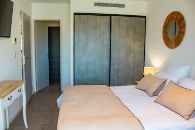 Bedroom 1: Queen size bed (160x200), private bathroom, direct access to the terrace and the swimming pool.