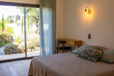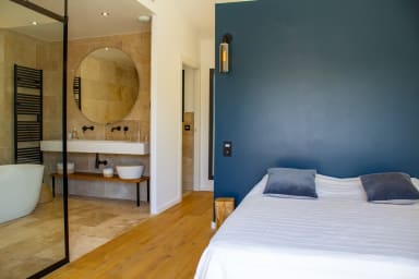 Chambre 1 : Suite parentale avec lit King Size (180200), salle de bain privative avec baignoire, douche et WC et accès direct à la terrasse avec vue sur la piscine.