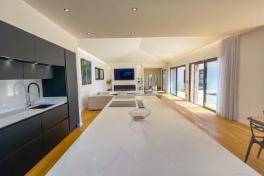 Espace de vie principal : Hall d’entrée ouvrant sur une vaste pièce à vivre comprenant un salon moderne, une salle à manger et une cuisine ouverte entièrement équipée (four, micro-ondes, réfrigérateur-congélateur, cafetière, grille-pain, bouilloire).