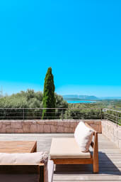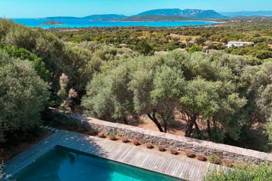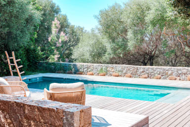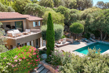 Magnifique villa haut de gamme avec piscine chauffée entièrement rénovée en 2022 avec vue sur la baie de San Ciprianu, idéalement située à seulement quelques minutes du restaurant le Cabanon Bleu et du centre-ville de Porto-Vecchio en Corse du Sud.