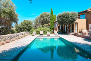 La villa possède un bel extérieur avec des terrasses en IPE sur différents niveaux, permettant de circuler simplement des espaces communs vers les chambres et la piscine.