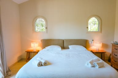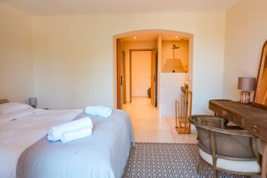 - Chambre 3 : Lit Queen Size (160200) avec salle de douche, WC et dressing. Accès piscine et terrasse.