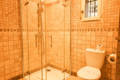 - Chambre 5 : Lit Queen Size (160200) +1lit simple (90200) avec salle de douche, WC et dressing. Accès piscine et terrasse.