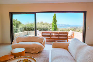 - Salon avec cheminée et grande baie vitrée donnant sur la terrasse. Belle vue mer sur toute la baie de San Ciprianu. Une seconde terrasse avec barbecue est accessible par le salon et la cuisine donnant la possibilité de déjeuner en extérieur tout en se protégeant du soleil et des grandes chaleurs de l’été.