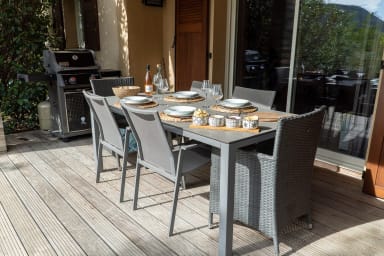- Terrasse avec mobilier de jardin : table, chaises, transats et barbecue/plancha