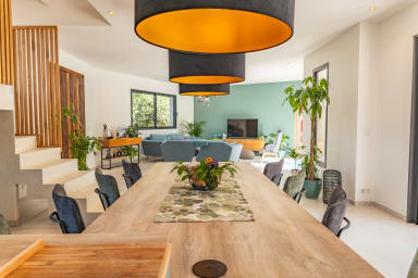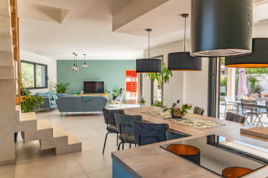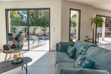 - Un salon/salle à manger donnant sur la terrasse et la piscine