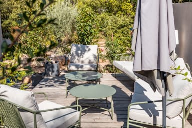 La terrasse est équipée de transats, un coin salon avec canapé, fauteuils et parasols.