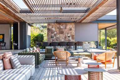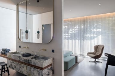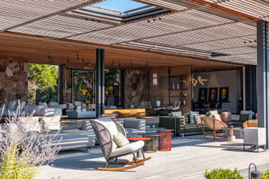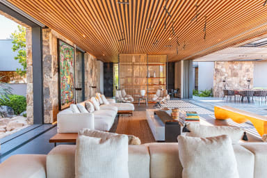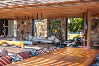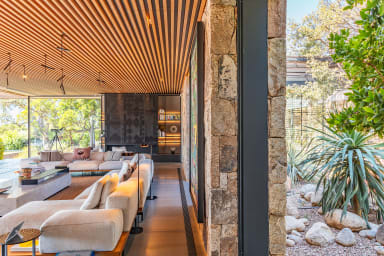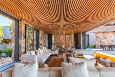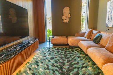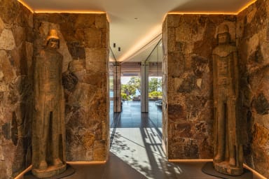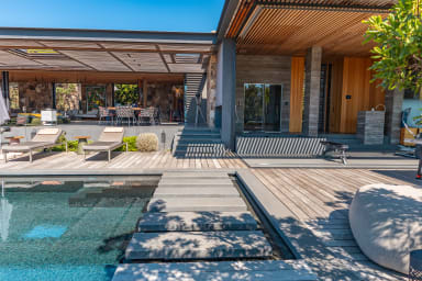 La villa offre des espaces de vie spacieux et des équipements haut de gamme. Elle dispose d’une cuisine indépendante professionnelle équipée d’une chambre froide, de deux lave-vaisselles, d’une machine à glaçons ainsi que de deux machines à café, Nespresso et à grains.