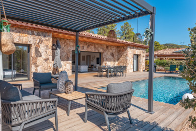 La villa possède est agréable extérieur , entièrement aménagée. La piscine mesure 9*3.6 et est chauffée et sécurisée par une alarme.