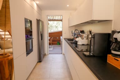 La cuisine donne également accès à une arrière terrasse extérieure avec plancha et coin repas. Idéal pour se protéger du soleil l’été.