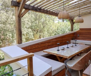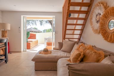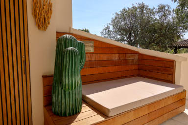 Séjournez dans cette charmante villa mitoyenne à l’ambiance « bohème » située en plein cœur du domaine de Cala Rossa, à Lecci en Corse du Sud. A seulement 200m de la plage privée de Cala Rossa, cette villa est composée de 3 chambres, deux salles de douche et un jacuzzi.