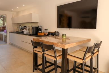 La villa possède un salon avec TV/salle à manger avec cuisine attenante.