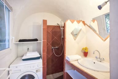 Cette villa séduit par son authenticité, mise en valeur par ses différentes voûtes, sa charpente en bois de fer provenant d’un ancien couvent de Sardaigne et son enduit à la chaux.
