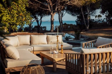 À l’extérieur, une vaste terrasse de 120 m² avec un salon de jardin et plancha pour les diners conviviaux, prolonge harmonieusement les volumes intérieurs et s’ouvre sur une piscine à débordement en forme de haricot (dimensions 6.70*12.50) sécurisée par une alarme périmétrique, invitant à la détente face à un cadre d’exception. Pour un confort maximal, profitez d'un bed 2 personnes, de 4 transats et 2 bains de soleil pour un moment de calme sous les pins qui font office d'ombrage. Cet endroit est un véritable havre de paix pour les amoureux de la mer et de la nature. Pour les plus sportifs, 2 padles et un canoë kayak sont à disposition pour des balades en mer.