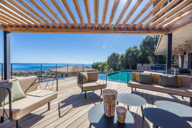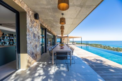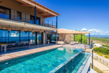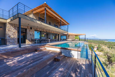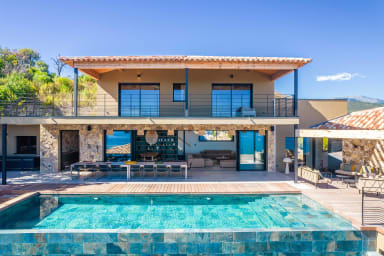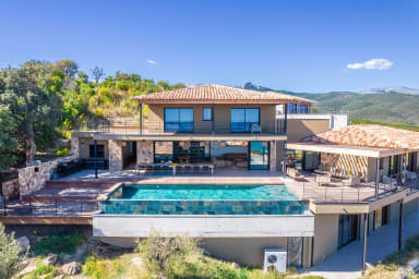 Splendide villa d'architecte à Sari - Solenzara, en Corse-du-Sud. Dominant la mer avec une vue panoramique spectaculaire, cette propriété de 300 m² incarne l’élégance et l’art de vivre méditerranéen. Un bien rare, entre luxe, espace et sérénité dans un cadre prestigieux et privilégié.